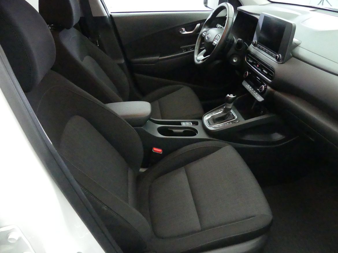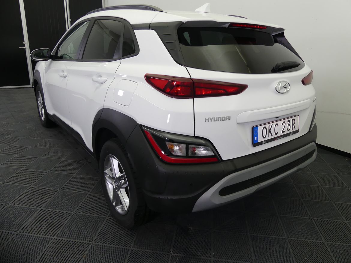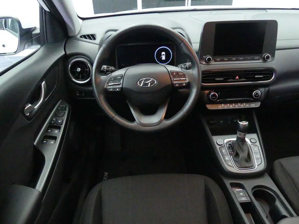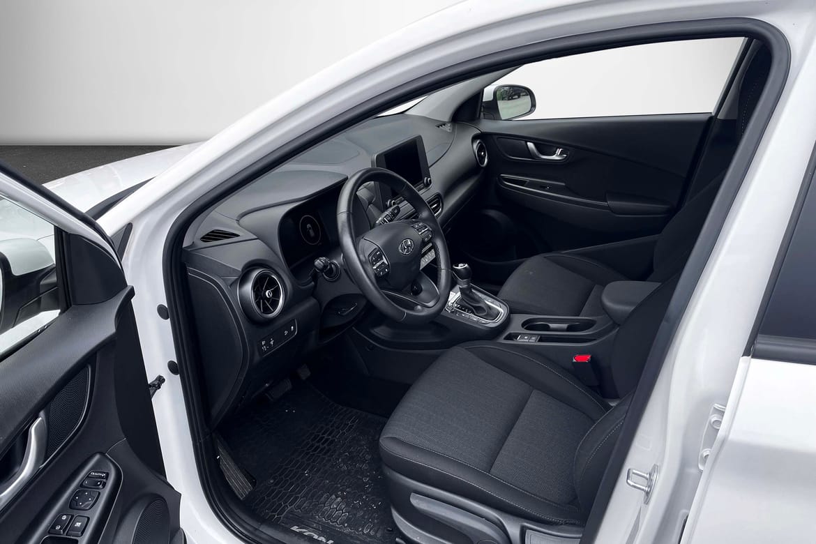 Välutrustad Hyundai Kona Essential Edition med automatlåda. Atlas White.
